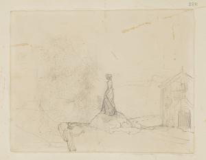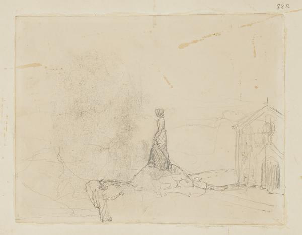 Figura femminile di profilo in cima a un dirupo e facciata di una chiesa. Figura femminile di profilo in cima a un dirupo e facciata di una chiesa