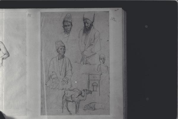 Studio di uomini mediorientali, di cammello, di cane accovacciato e di un edificio. Studio di uomini mediorientali, di cammello, di cane accovacciato e di un edificio