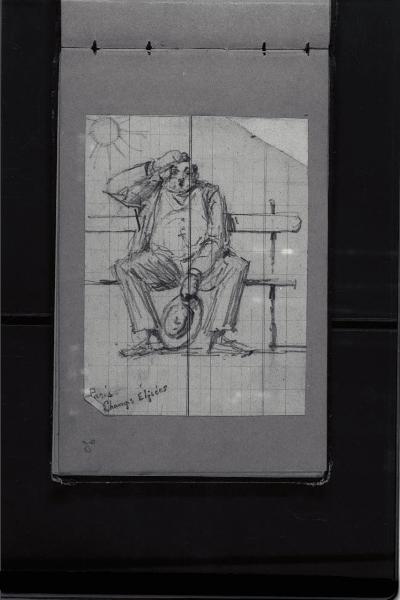Uomo seduto con cappello in mano agli Champs Elysees a Parigi