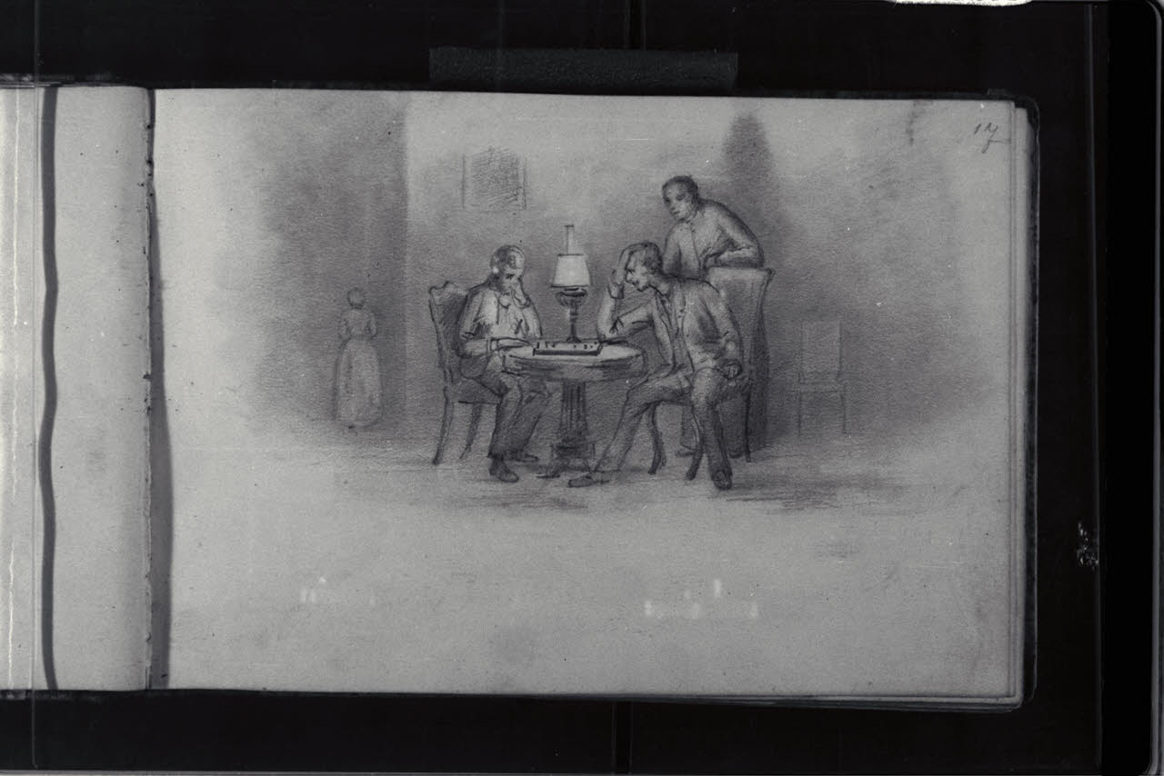 Interno con figure intente a un gioco da tavolo