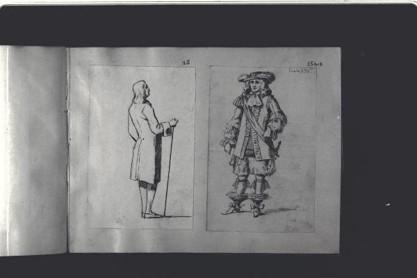 Uomo di spalle con bastone vestito alla foggia settecentesca