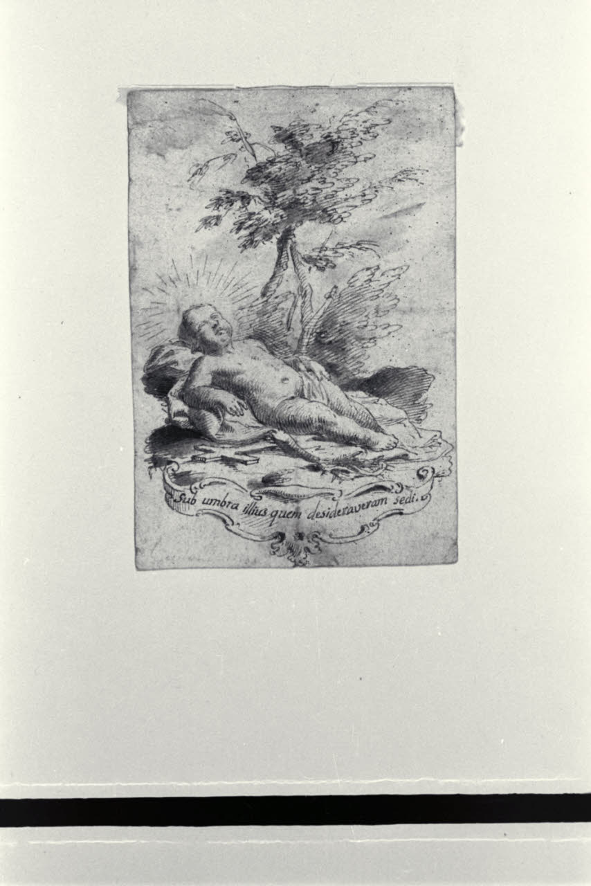 Il bambino Gesù dormiente per terra, su un lenzuolo, presso ad un gruppo di alberi. Il bambino Gesù dormiente per terra, su un lenzuolo, presso ad un gruppo di alberi