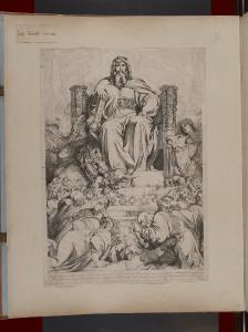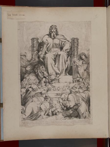 - NOTIZIE STORICO CRITICHE Si tratta di una delle sei incisioni dedicate all'Apocalisse di Giovanni che Luigi Sabatelli esegue tra il 1809 il 1810. E' questa l'ultima impresa incisoria del Sabatelli, il quale, ad eccezione delle illustrazioni con l'episodio del Pier Capponi tratta dal Guicciardini, sembra abbandonò in seguito l'incisione su rame. \nIn età avanzata però, nel 1836-39, riprenderà questo preciso soggetto negli affreschi per il catino absidale della chiesa di Valmadrera presso Lecco, raffigurando appunto i "Ventiquattro Signori davanti al trono di Dio".\nPer quanto riguarda la composizione di questo specifico episodio, Anna Forlani Tempesti ha osservato un'interessante somiglianza con il "Giove e Teti" di Ingres del 1811, di cui potrebbe costituire un precedente iconografico. Inoltre è possibile confrontare la figura di Dio Padre con il Giove in trono in una delle incisioni dell'Iliade di John Flaxman.