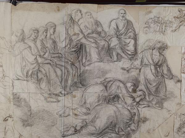 - NOTIZIE STORICO CRITICHE Come un attento conftronto, il disegno si riferisce probabilmente agli affreschi per il catino absidale della chiesa parrocchiale di Valmadrera (Lecco), eseguiti tra 1836 e 1839. Il tema è quello de "I ventiquattro Signori davanti al trono di Dio", precedentemente affrontato da Sabatelli in una serie di incisioni rislaneti al 1809-1810.