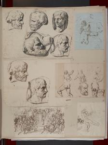 Nudo virile inginocchiato e due profili maschili