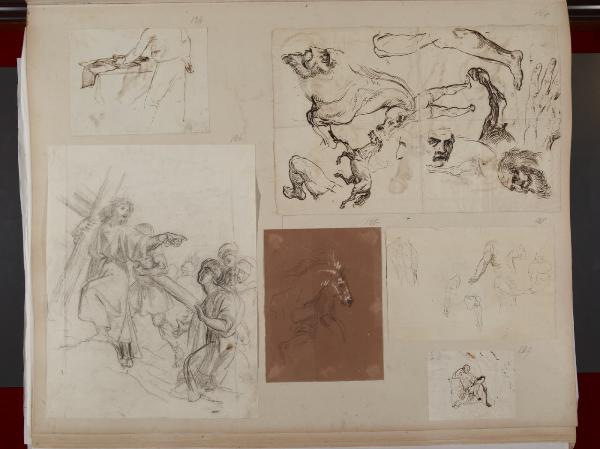 Studio di un cavallo in corsa, teste virili e particolari anatomici