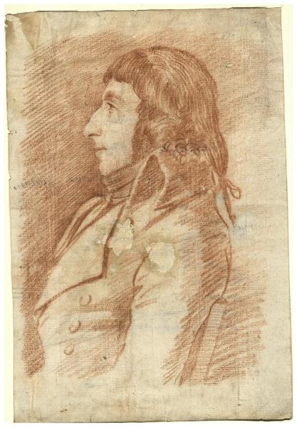 - NOTIZIE STORICO CRITICHE L'iscrizione presente sul verso del foglio lascia aperta l'ipotesi che il ritratto a mezzo busto di profilo possa essere quello di Napoleone. A un primo confronto con le immagini che codificano la prima iconografia napoleonica, fondata sui ritratti giovanili di Appiani (si veda la scheda A 49/I) o Antoine-Jean Gros, la somiglianza non appare stringente. Tuttavia, l'uomo raffigurato mostra qualche somiglianza con il Napoleone ripreso da André Dutertre durante la campagna d'Egitto, soprattutto per il profilo del naso e il mento pronunciato.