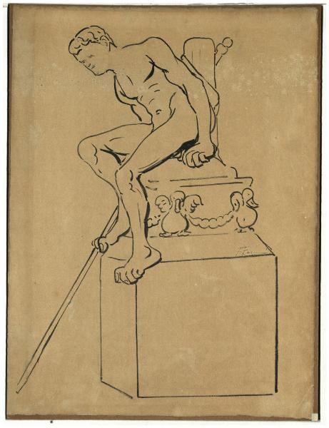 Figura maschile nuda seduta su un piedestallo. Figura maschile nuda seduta su un piedestallo