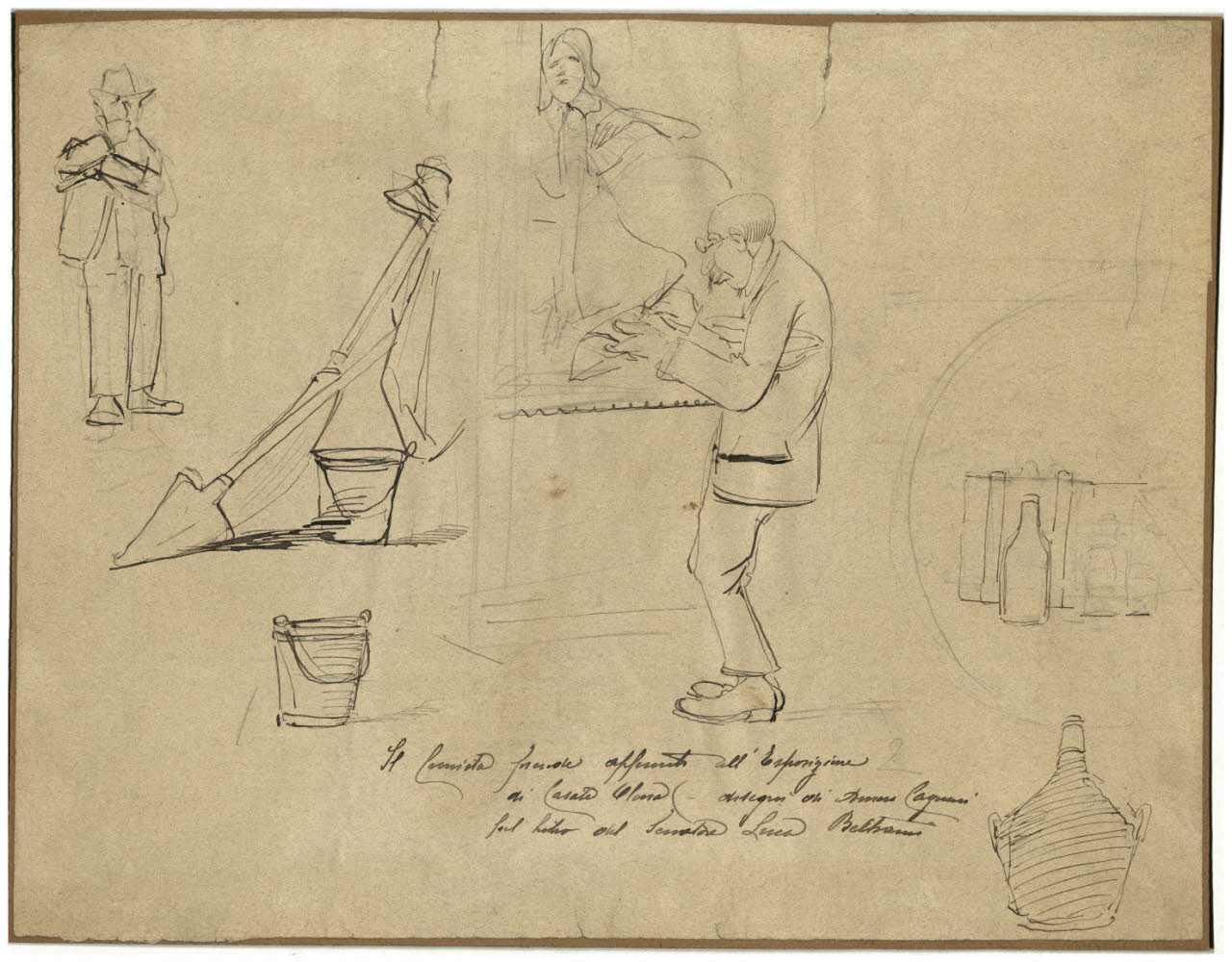 matita, inchiostro nero a penna su carta bianca, incollata su cartone marrone