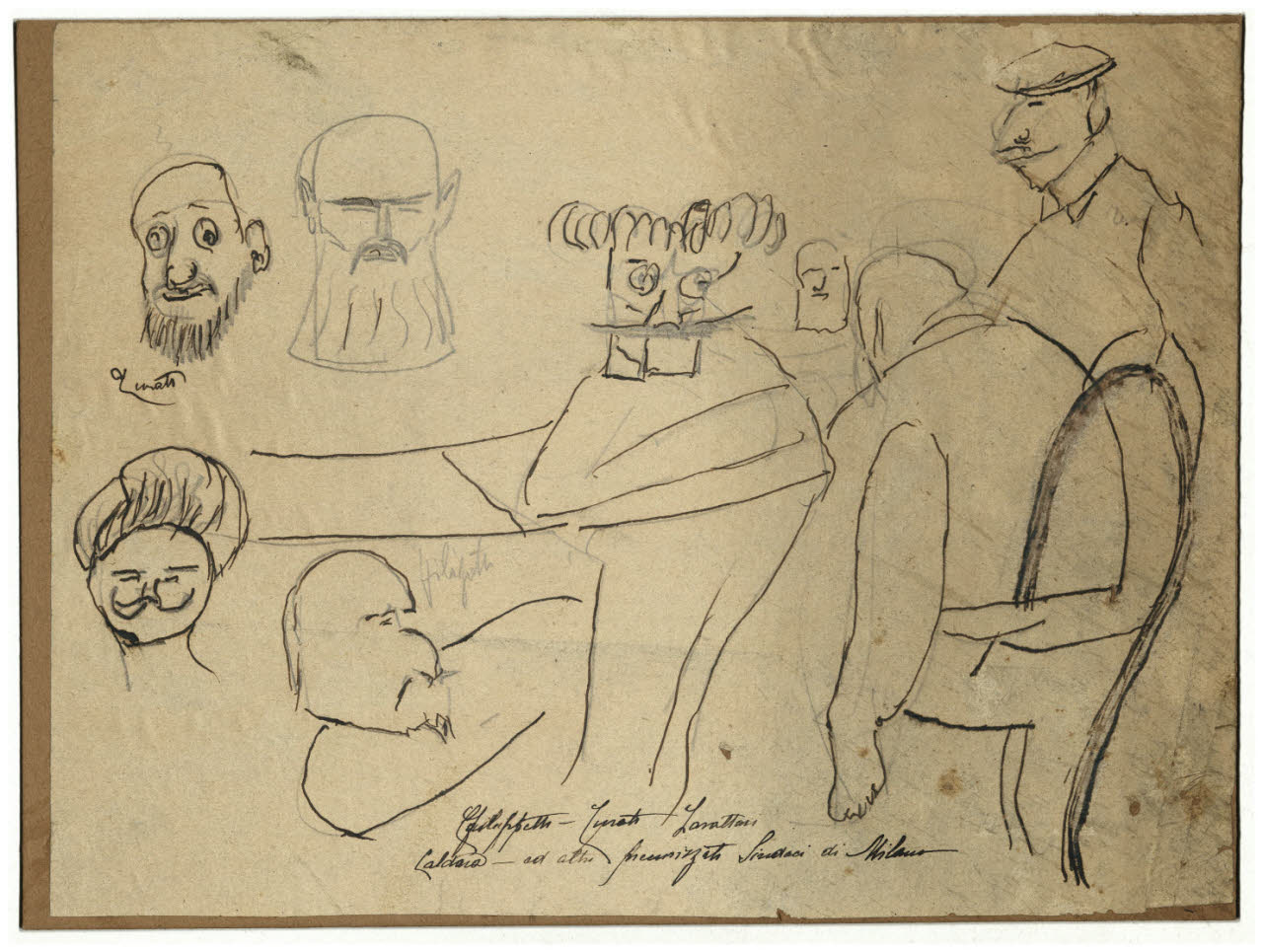 matita, inchiostro nero a penna su carta bianca, incollata su cartone marrone