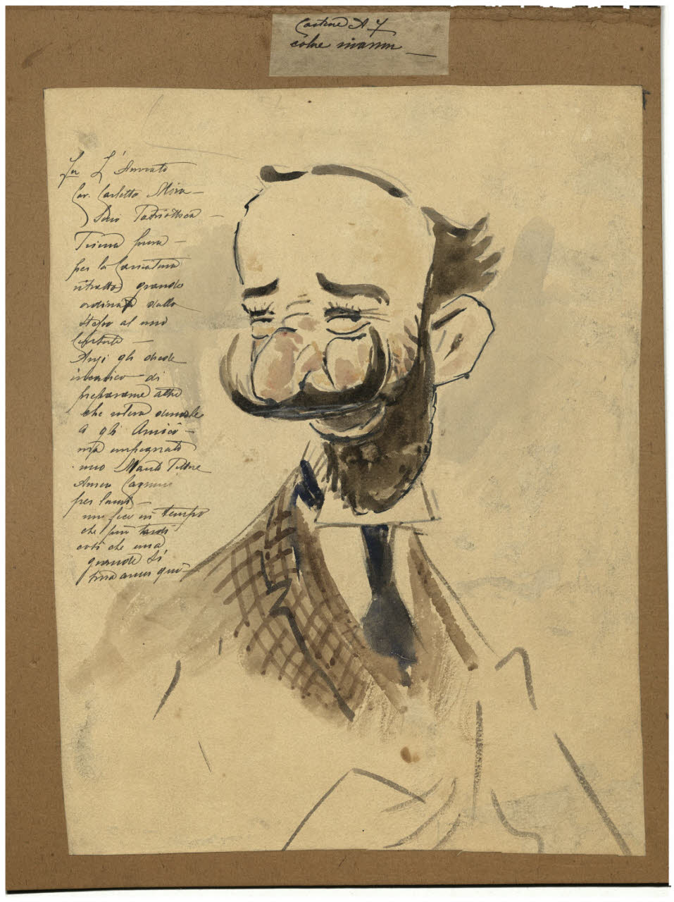 matita, inchiostro nero a penna, acquerello su carta bianca, incollata su cartone marrone