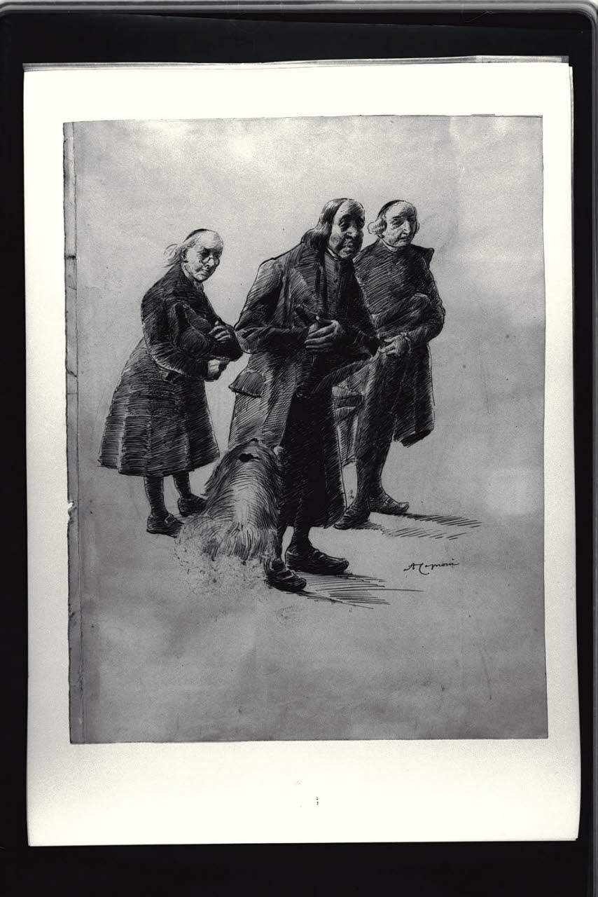 Scena satirica : tre preti con un cane. Scena satirica : tre preti con un cane