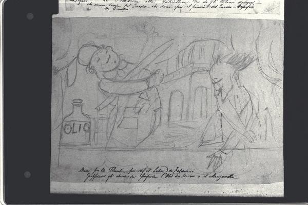 Scena satirica : due uomini con una bottiglia d'olio. Scena satirica : due uomini con una bottiglia d'olio