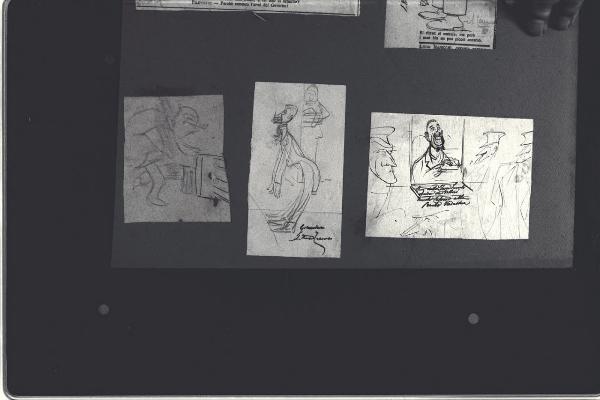 matita, inchiostro nero a penna su carta bianca, incollata su cartone marrone