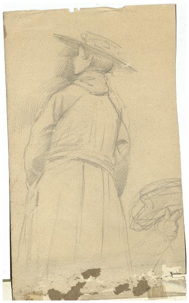 Figura femminile di schiena e mano con cappello. Figura femminile di schiena e mano con cappello