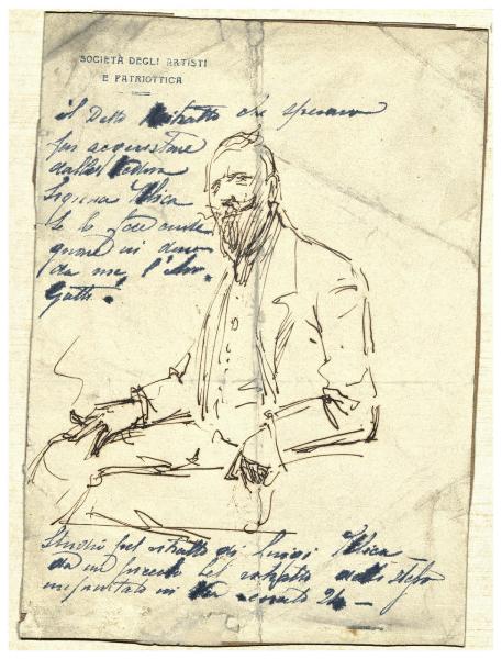 inchiostro nero a penna su carta bianca incollata su carta marrone intestata "Società degli artisti e patriottici"