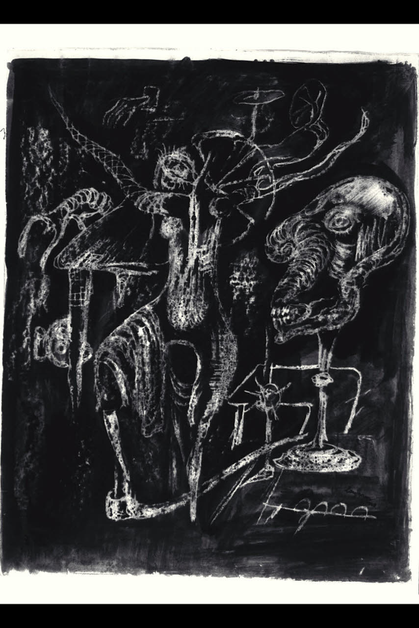 inchiostro a pennello, matite colorate su carta bianca