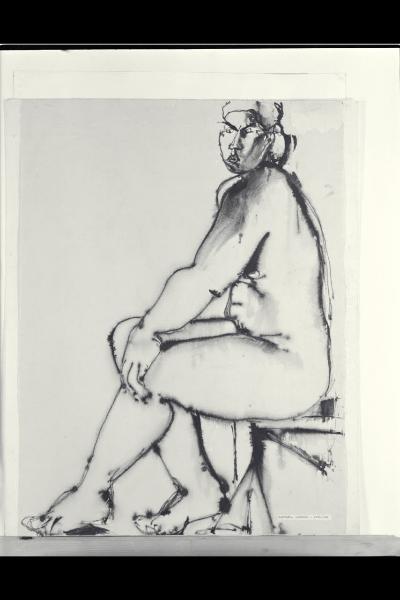 pennarello, inchiostro a penne e pennello su carta grigia incollata su cartoncino