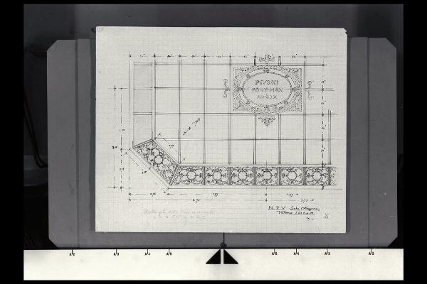 Parte del velario della sala ottagona con indicazione del motivo a decorazione della cornice e della cartella centrale con dedica a Pio XI nella Nuova Pinacoteca Vaticana