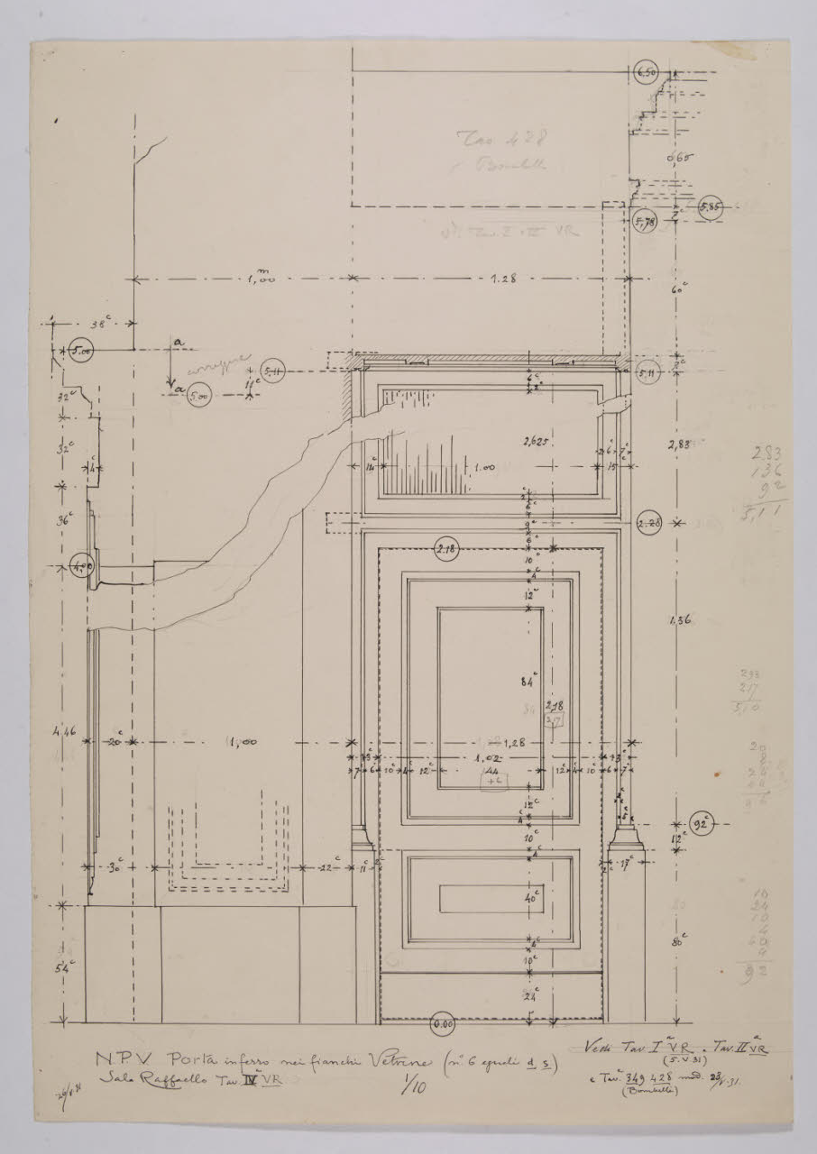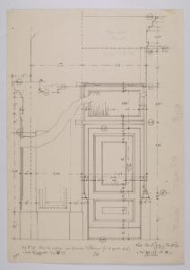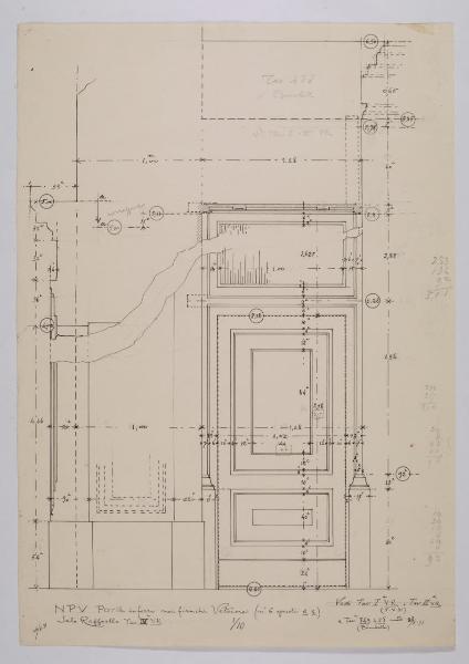 Alzato e sezione della porta in ferro nei fianchi delle vetrine della sala Raffaello nella Nuova Pinacoteca Vaticana