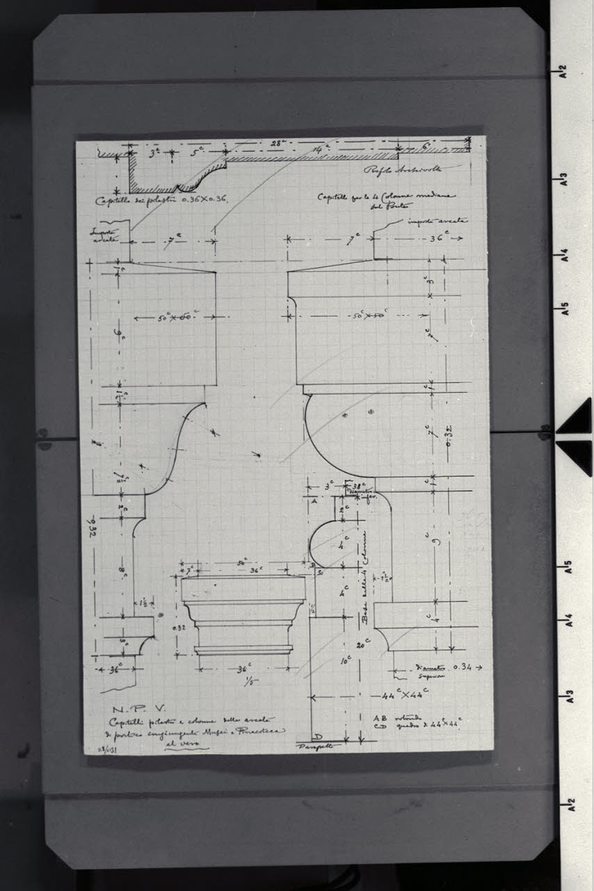 Alzato e sezione di capitelli, pilastri e colonne delle arcate del portico di congiungimento nella Nuova Pinacoteca Vaticana