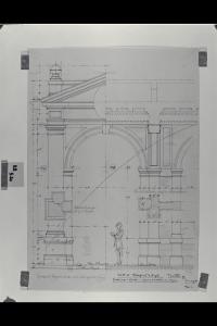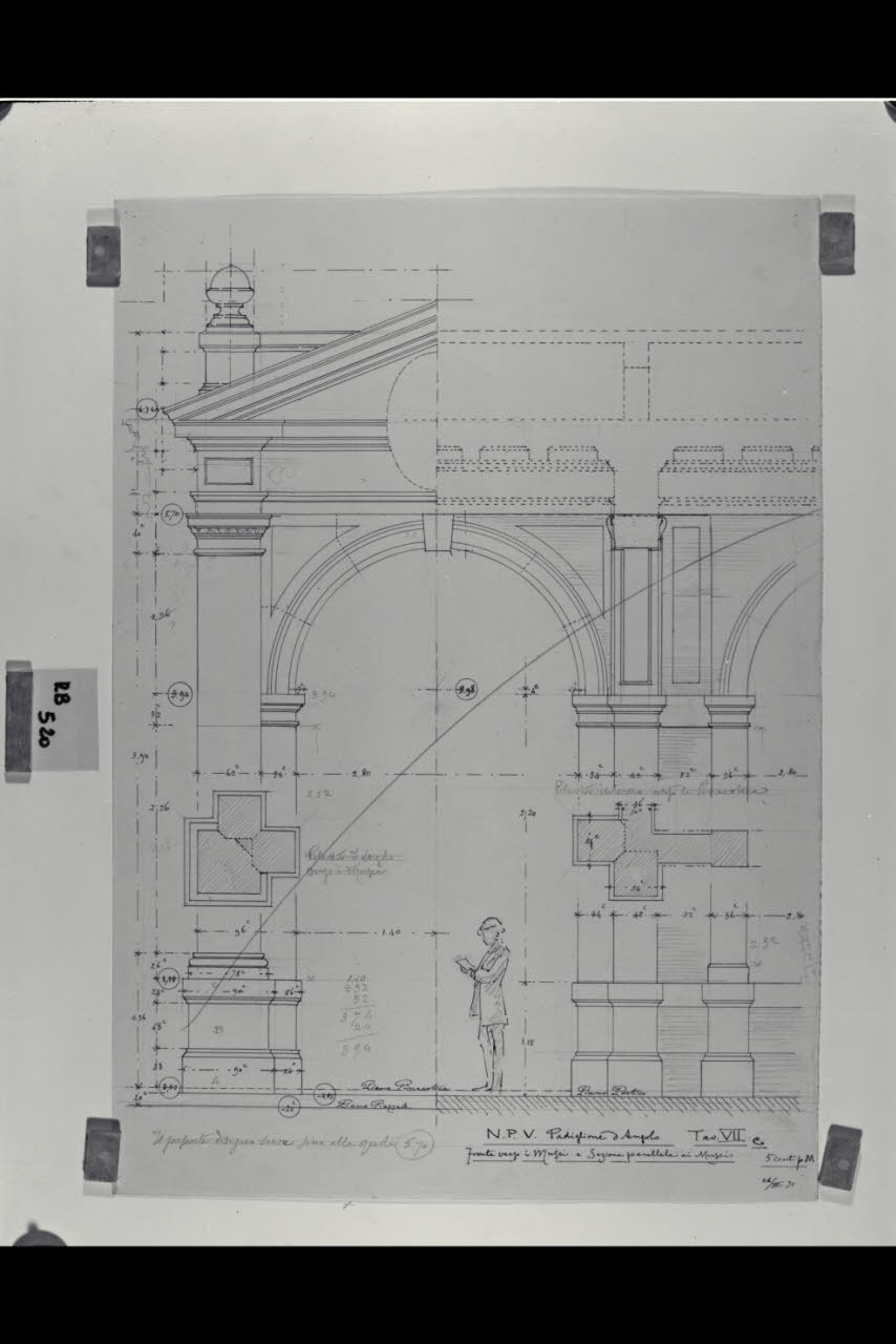 Fronte verso i musei e sezione parallela ai musei del padiglione d'angolo nella Nuova Pinacoteca Vaticana