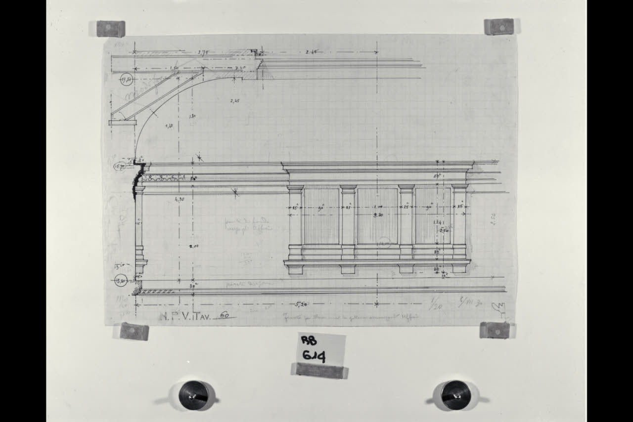 Prospetto della parete di fondo verso gli uffici del piano ammezzato nella Nuova Pinacoteca Vaticana