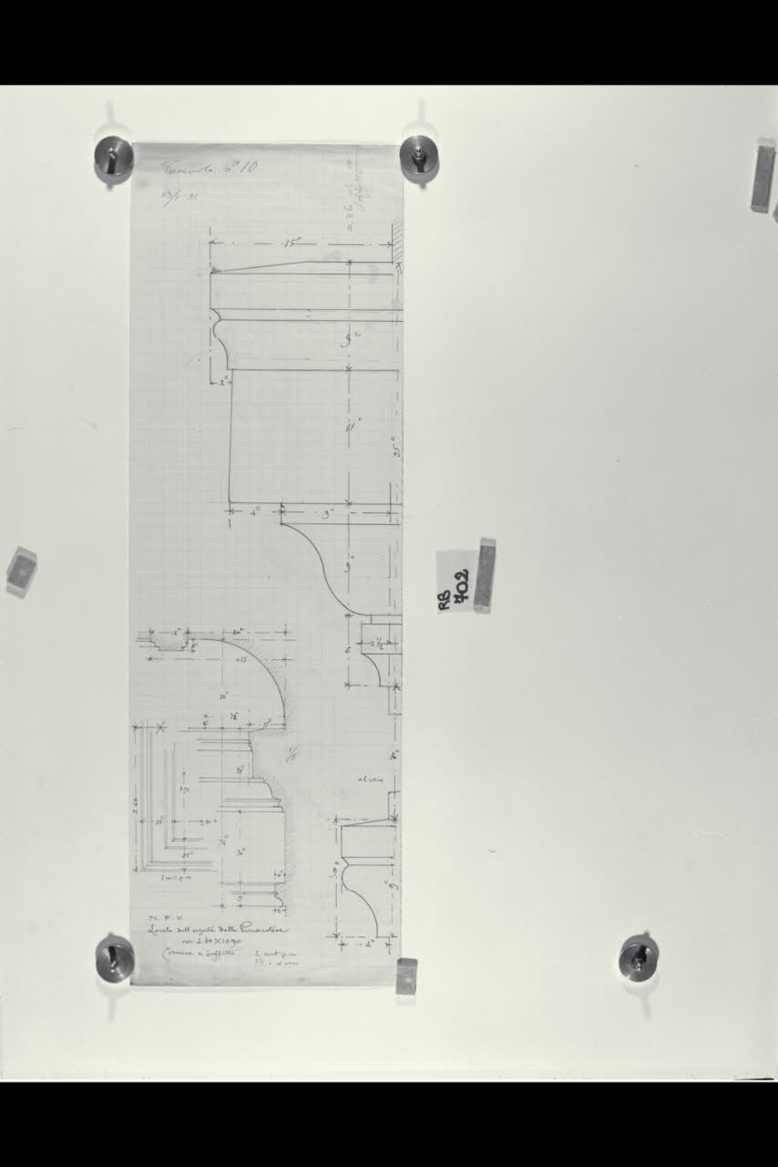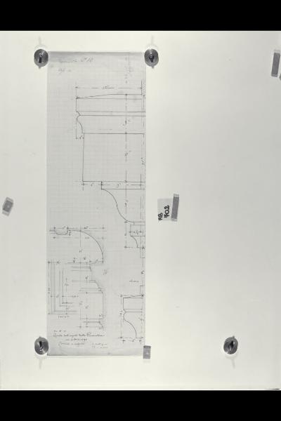 Piante e sezioni con dettagli dei profili degli ornati delle cornici e del soffitto nella Nuova Pinacoteca Vaticana