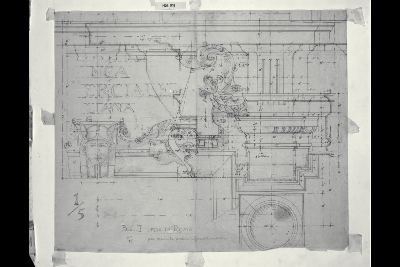 Roma, Sede della Banca Commerciale Italiana: Alzato e sezioni della cornice e del fregio del portale e della finestra centrale del prospetto verso corso Umberto I