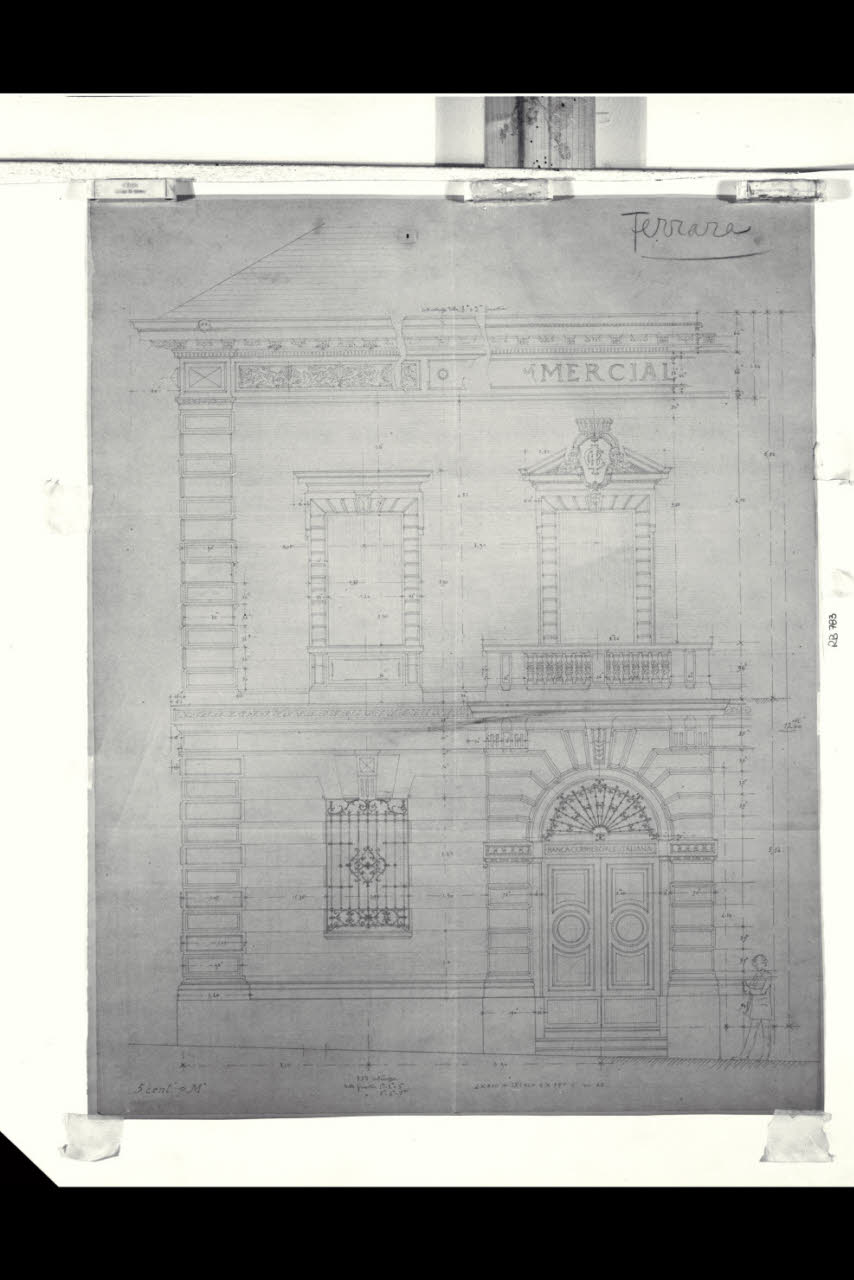 Particolare in corrispondenza della porta d'ingresso del prospetto principale della sede di Ferrara della Banca Commerciale Italiana