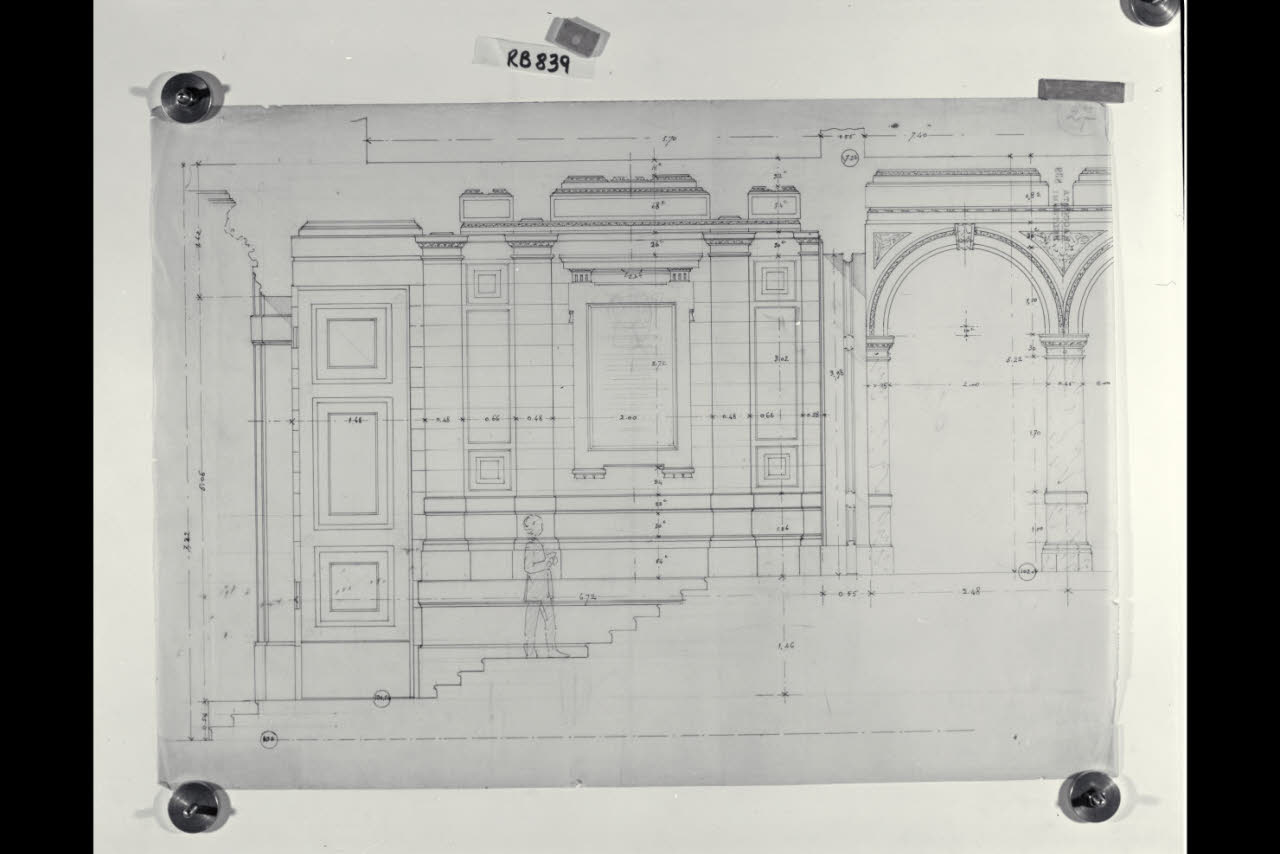 Sezione longitudinale dell'androne d'ingresso da piazza della Scala alla sede di Milano della Banca Commerciale Italiana in piazza della Scala e via Manzoni. Sezione longitudinale dell'androne d'ingresso da piazza della Scala alla sede di Milano della Banca Commerciale Italiana in piazza della Scala e via Manzoni