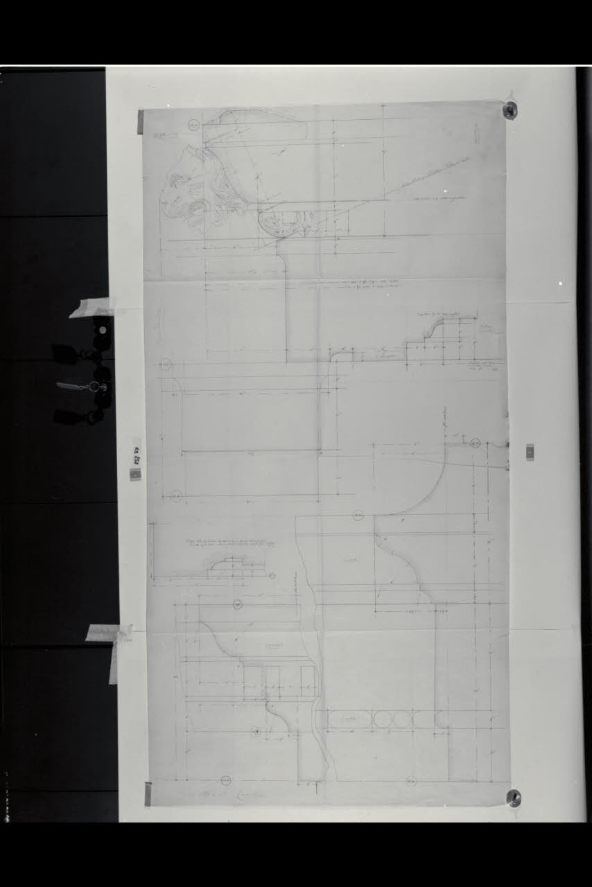 Dettagli del cornicione di un prospetto della sede di Milano della Banca Commerciale Italiana in piazza della Scala e via Manzoni. Dettagli del cornicione di un prospetto della sede di Milano della Banca Commerciale Italiana in piazza della Scala e via Manzoni