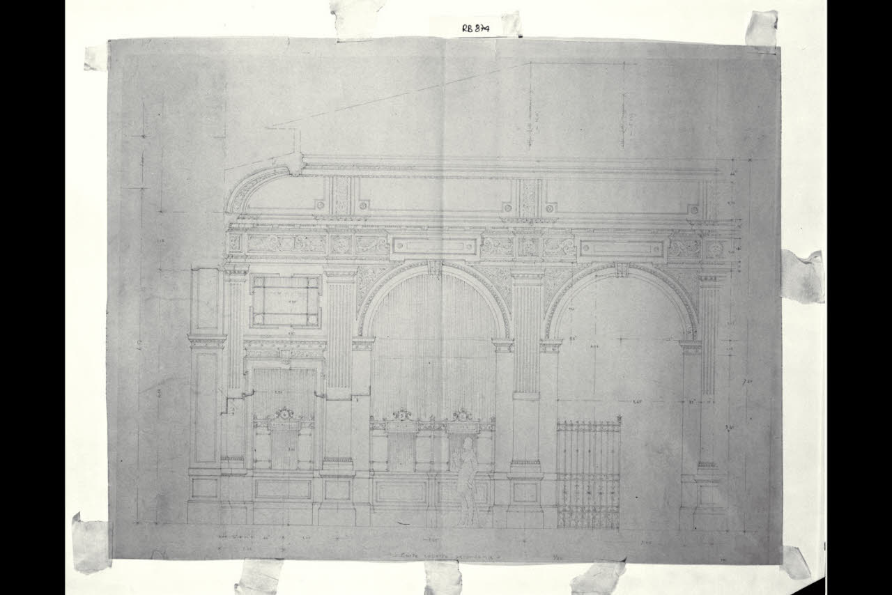 Sezione longitudinale della corte coperta secondaria nella sede di Milano della Banca Commerciale Italiana in piazza della Scala e via Manzoni. Sezione longitudinale della corte coperta secondaria nella sede di Milano della Banca Commerciale Italiana in piazza della Scala e via Manzoni