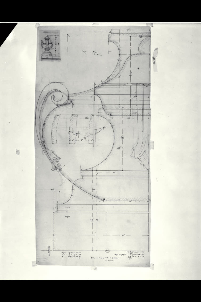 Alzato e sezione di un particolare del vaso per il cornicione dell'attico nella sede di Milano della Banca Commerciale Italiana in piazza della Scala e via Manzoni. Alzato e sezione di un particolare del vaso per il cornicione dell'attico nella sede di Milano della Banca Commerciale Italiana in piazza della Scala e via Manzoni