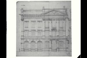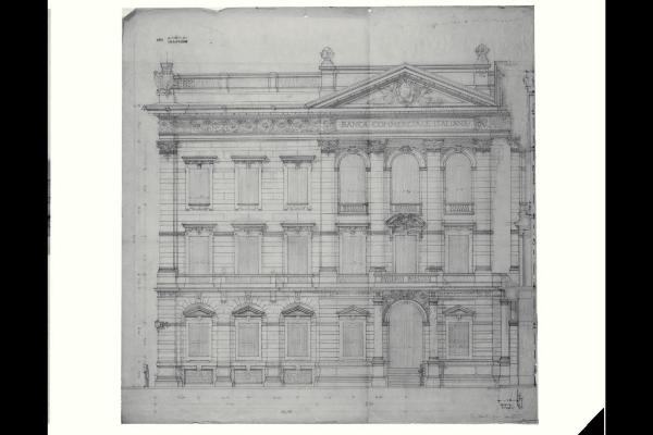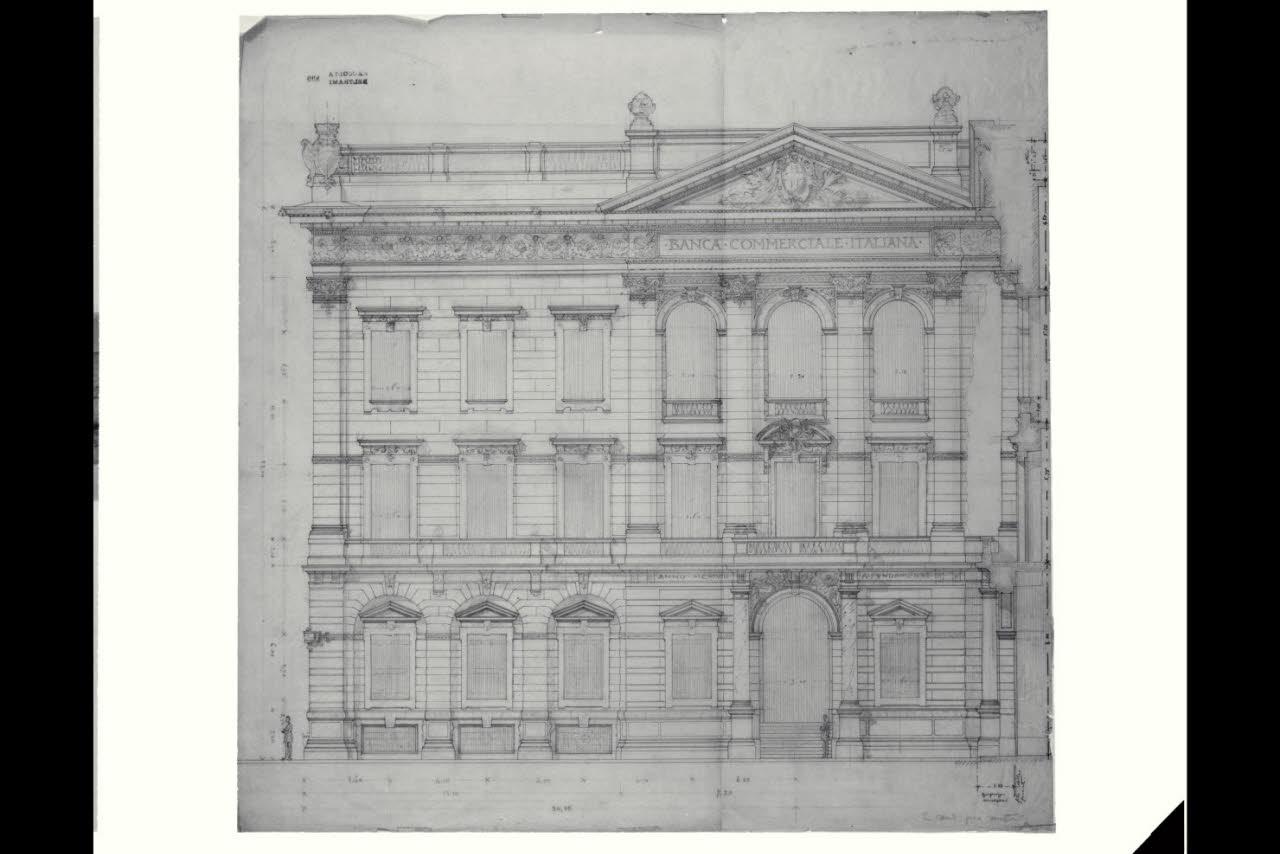 Dettaglio del prospetto verso piazza della Scala della sede di Milano della Banca Commerciale Italiana in piazza della Scala e via Manzoni. Dettaglio del prospetto verso piazza della Scala della sede di Milano della Banca Commerciale Italiana in piazza della Scala e via Manzoni