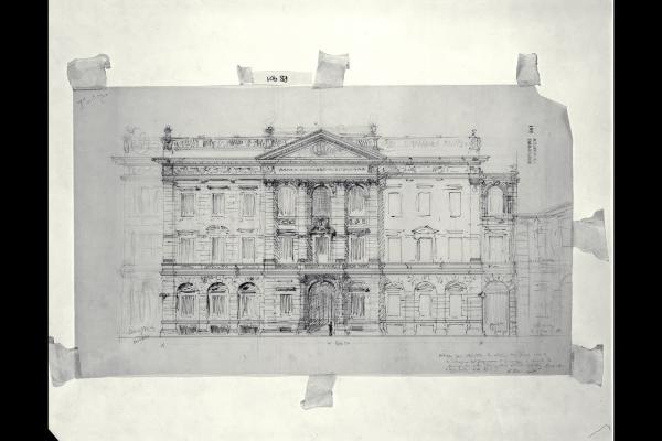 Schizzo del prospetto verso piazza della Scala della sede di Milano della Banca Commerciale Italiana in piazza della Scala e via Manzoni. Schizzo del prospetto verso piazza della Scala della sede di Milano della Banca Commerciale Italiana in piazza della Scala e via Manzoni