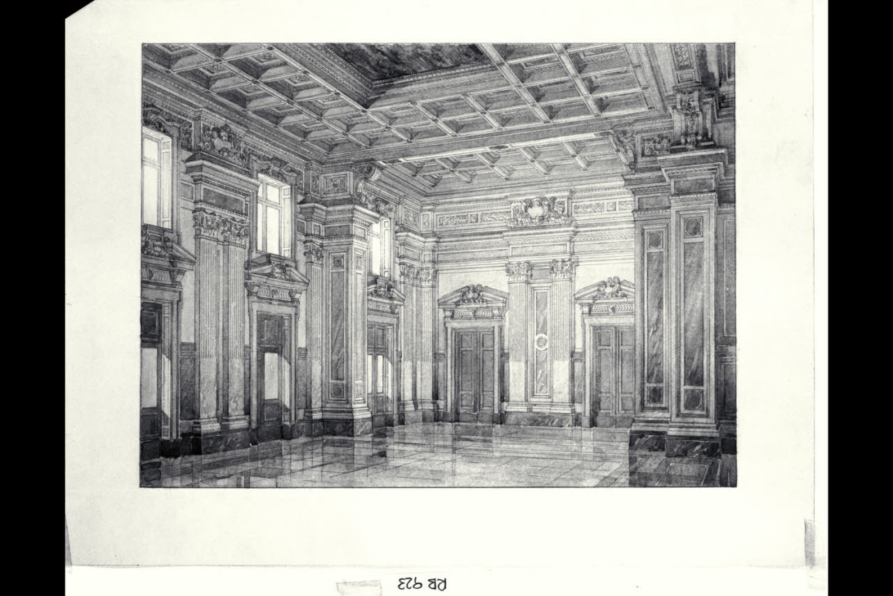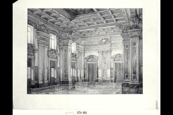 Assonometria della sala adunanze della sede centrale di Milano della Banca Commerciale Italiana in piazza della Scala e via Santa Margherita. Assonometria della sala adunanze della sede centrale di Milano della Banca Commerciale Italiana in piazza della Scala e via Santa Margherita
