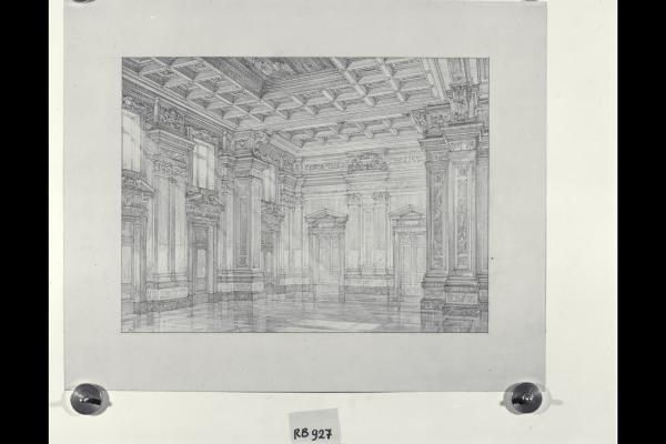 Assonometria della sala delle adunanze nella sede centrale di Milano della Banca Commerciale Italiana in piazza della Scala e via Santa Margherita. Assonometria della sala delle adunanze nella sede centrale di Milano della Banca Commerciale Italiana in piazza della Scala e via Santa Margherita