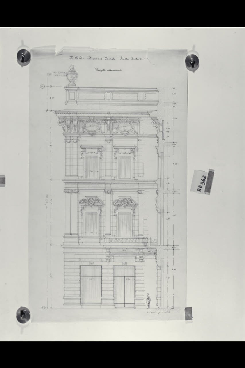 Alzato e sezione del prospetto verso piazza Scala della sede di Milano della Banca Commerciale Italiana in piazza della Scala e via Santa Margherita. Alzato e sezione del prospetto verso piazza Scala della sede di Milano della Banca Commerciale Italiana in piazza della Scala e via Santa Margherita