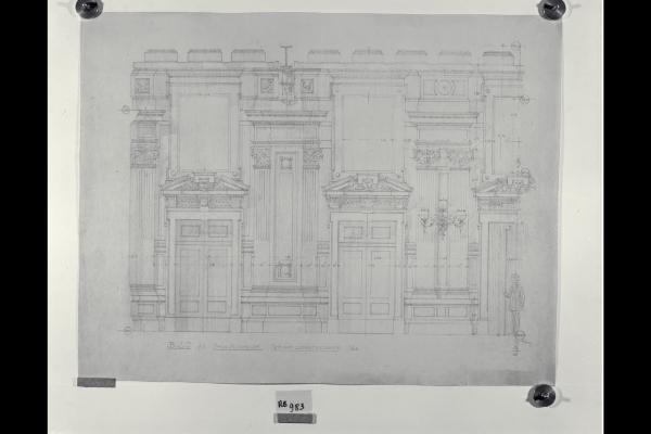 Sezione longitudinale della sala assemblee nella sede centrale di Milano della Banca Commerciale Italiana in piazza della Scala e via Santa Margherita. Sezione longitudinale della sala assemblee nella sede centrale di Milano della Banca Commerciale Italiana in piazza della Scala e via Santa Margherita