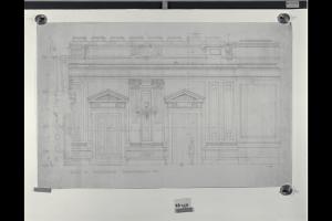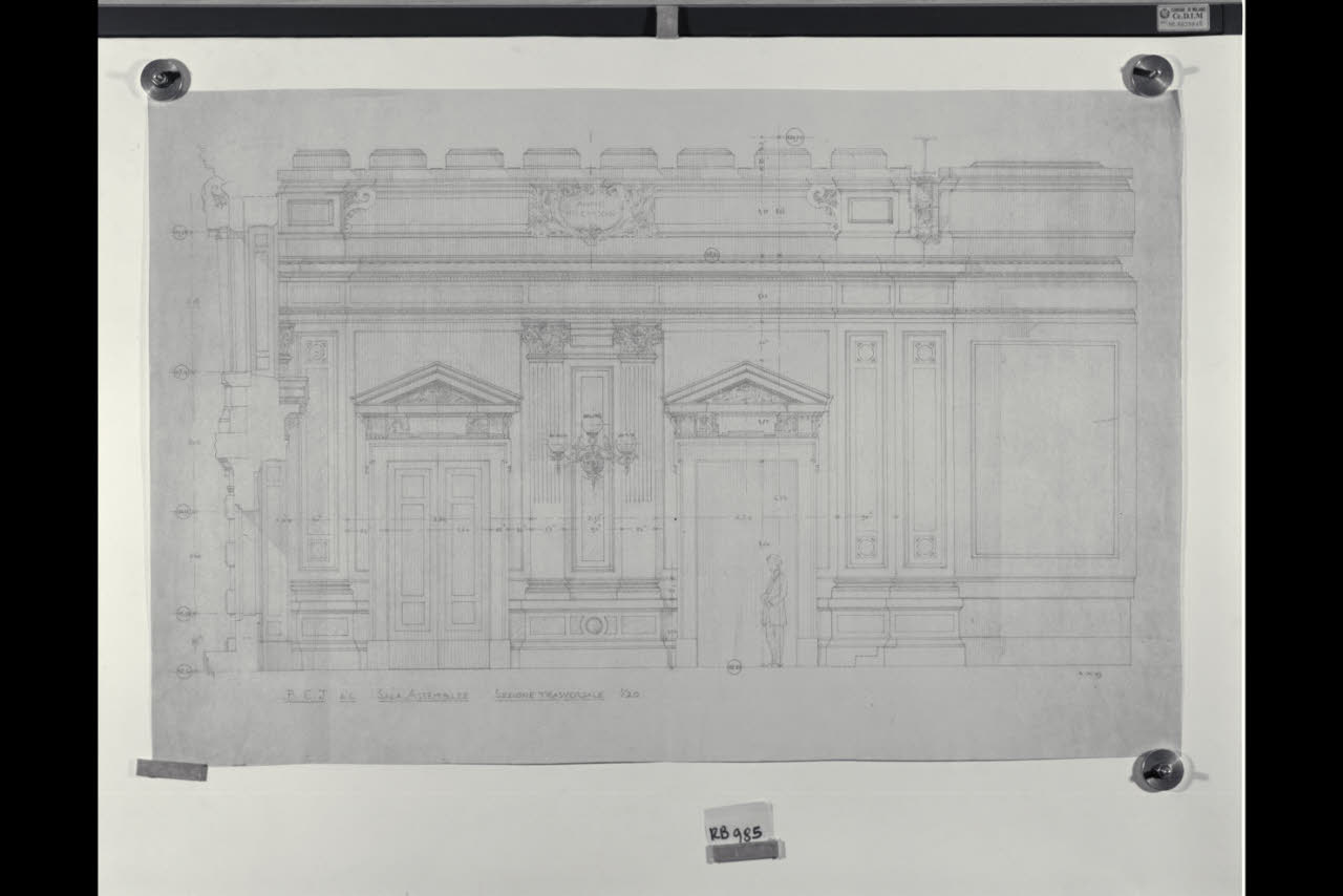 Sezione trasversale della sala assemblee nella sede centrale di Milano della Banca Commerciale Italiana in piazza della Scala e via Santa Margherita. Sezione trasversale della sala assemblee nella sede centrale di Milano della Banca Commerciale Italiana in piazza della Scala e via Santa Margherita