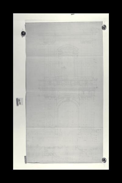 Particolare della porta d'ingresso e della finestra soprastante nel prospetto verso piazza Scala nella sede di Milano della Banca Commerciale Italiana. Particolare della porta d'ingresso e della finestra soprastante nel prospetto verso piazza Scala nella sede di Milano della Banca Commerciale Italiana