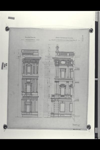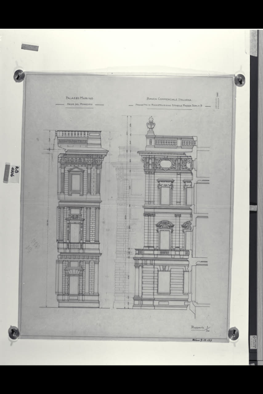 Milano, Palazzo Marino e Banca Commerciale Italiana, prospetto su piazza della Scala e via Santa Margherita. Prospetto di Palazzo Marino e della sede centrale di Milano della Banca Commerciale Italiana in piazza della Scala e via Santa Margherita