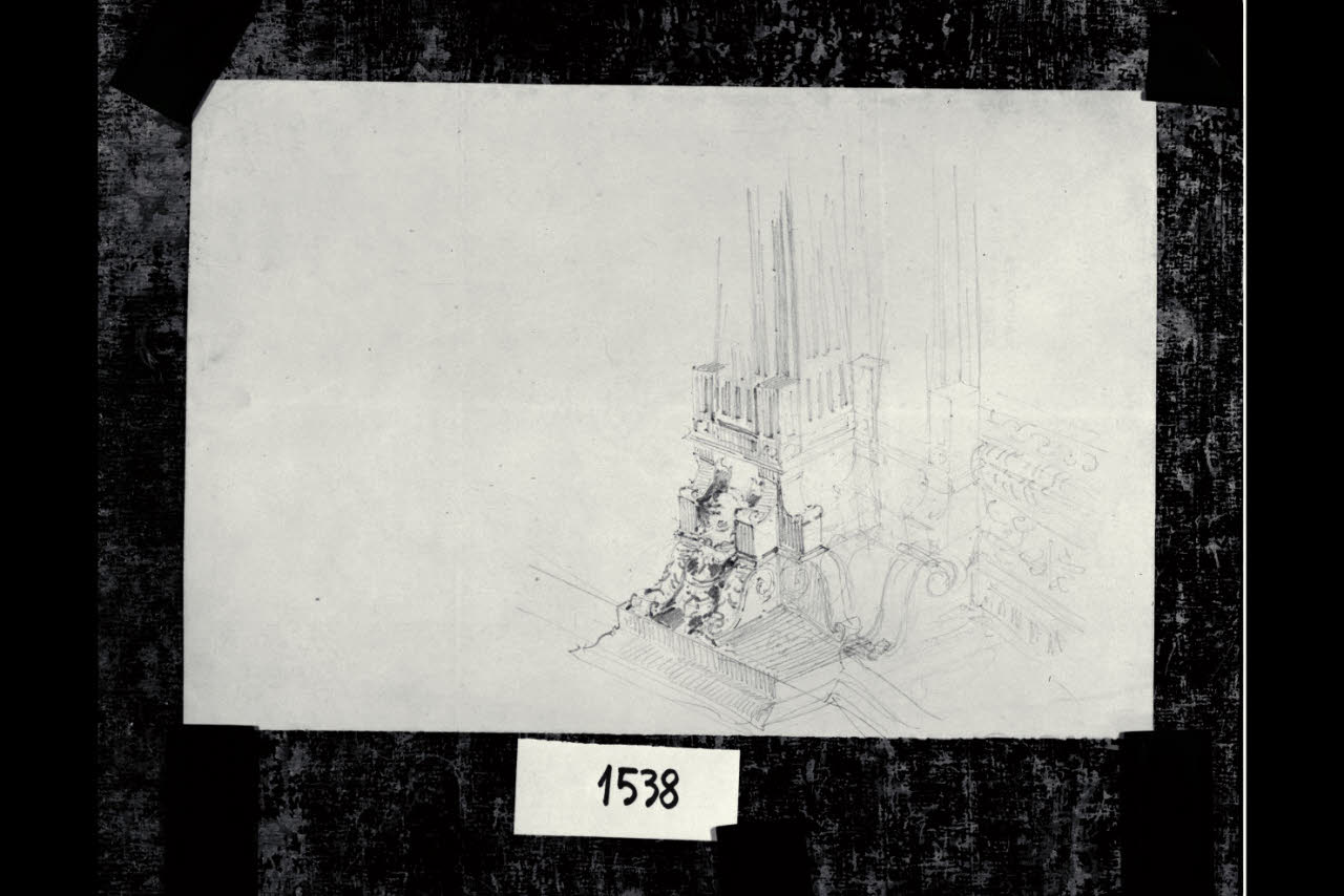 Milano, Palazzo Marino, schizzo assonometrico delle mensole della facciata. Milano, Palazzo Marino. Mensola dei prospetti. Schizzo assonometrico