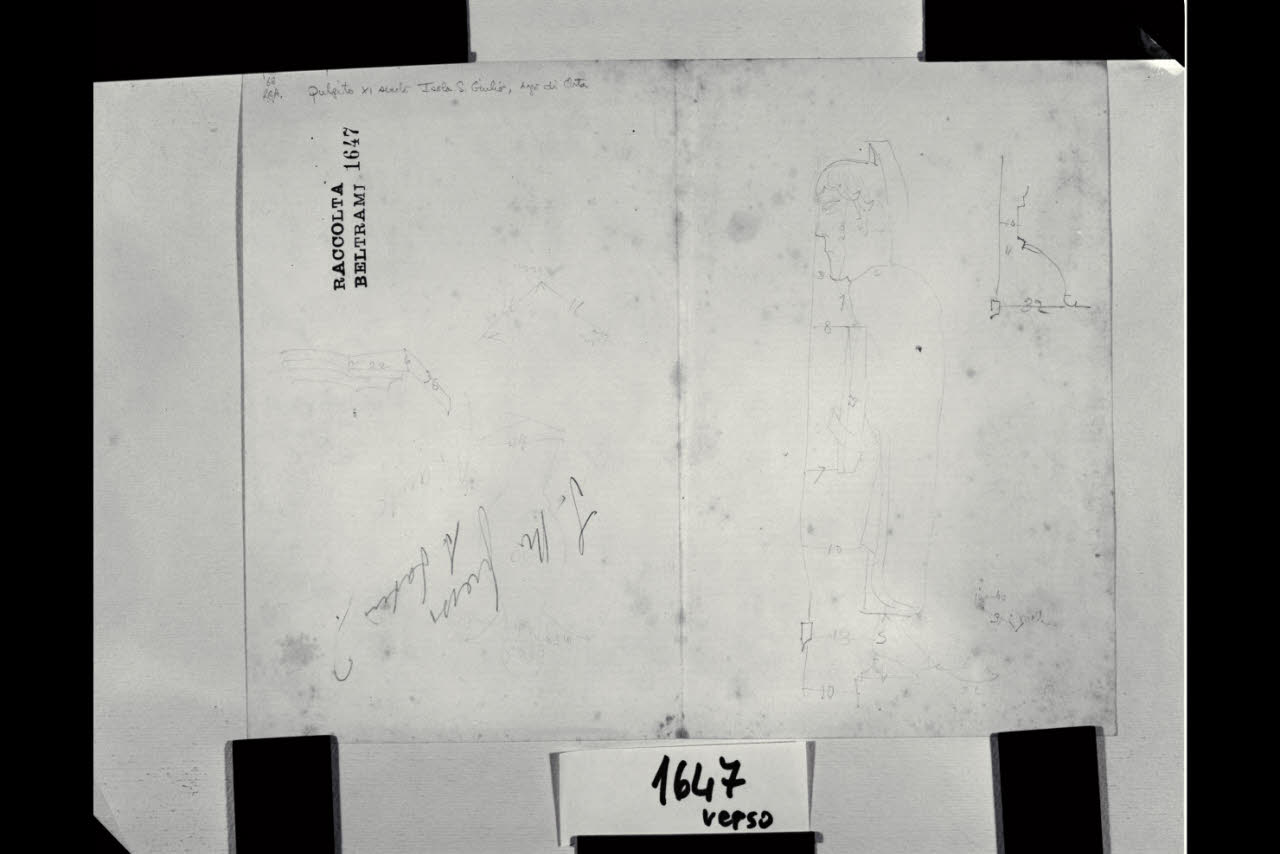 Foglio di appunti e schizzi. Rilievo di una statua di Santo. Foglio di appunti e schizzi. Rilievo di una statua di Santo