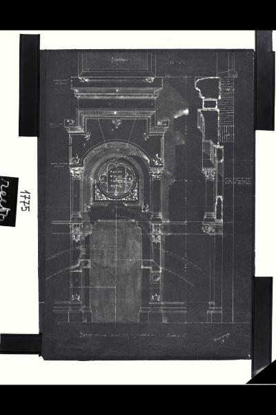 Tempio Israelitico di via della Guastalla. Porta della cella delle Bibbie. Alzato e sezioni. Milano, Tempio Israelitico, via Guastalla. Porta della cella delle Bibbie. Alzato e sezioni