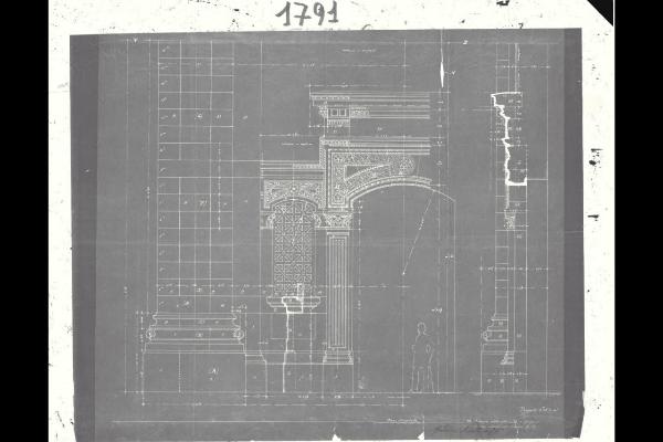 Tempio Israelitico di via della Guastalla. Prospetto sulla via Guastalla. Porta di ingresso principale. Dettagli in alzato e sezione. Milano, Tempio Israelitico, via Guastalla. Prospetto sulla via Guastalla. Porta di ingresso principale. Dettagli in alzato e sezione