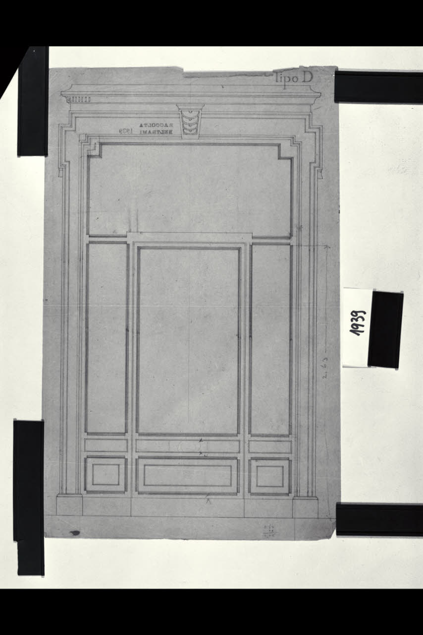 Alzato di una porta a vetri ad anta centrale a pannelli laterali con sopraporta. Alzato di una porta a vetri ad anta centrale a pannelli laterali con sopraporta