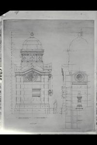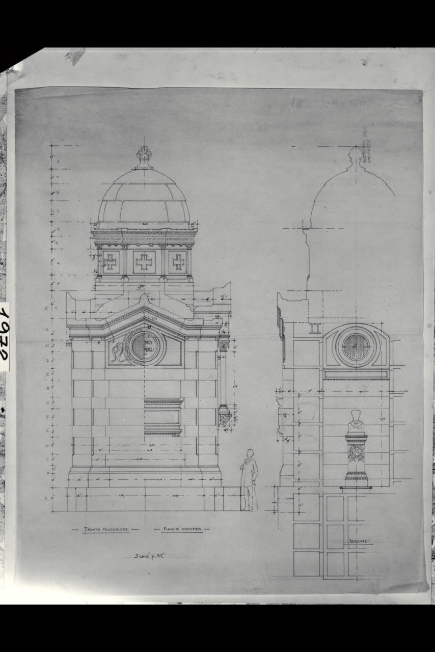 Milano, Cimitero Monumentale. Cappella Rossi. Fronte posteriore, fianco sinistro e sezione. Milano, Cimitero Monumentale. Cappella Rossi. Fronte posteriore, fianco sinistro e sezione