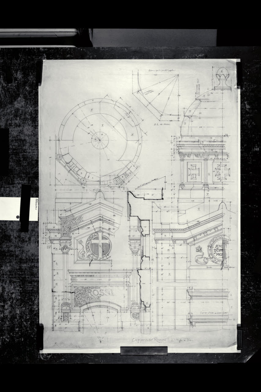 Milano, Cimitero Monumentale. Cappella Rossi, dettagli della zona superiore delle fronti e sezioni orizzontali della cupolina. Milano, Cimitero Monumentale. Cappella Rossi, dettagli della zona superiore delle fronti e sezioni orizzontali della cupolina